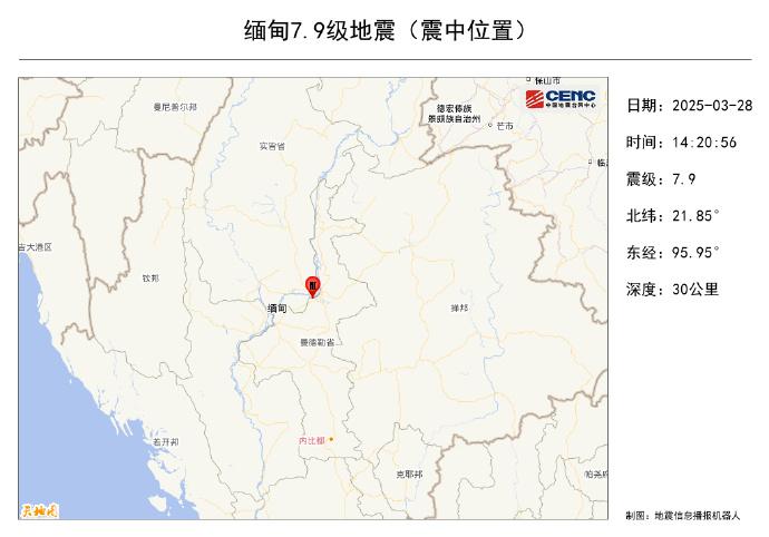 中国地震台网正式测定:3月28日14时20分,缅甸(北纬21.85度,东经95.95度)发生7.9级地震,震源深度30千米。