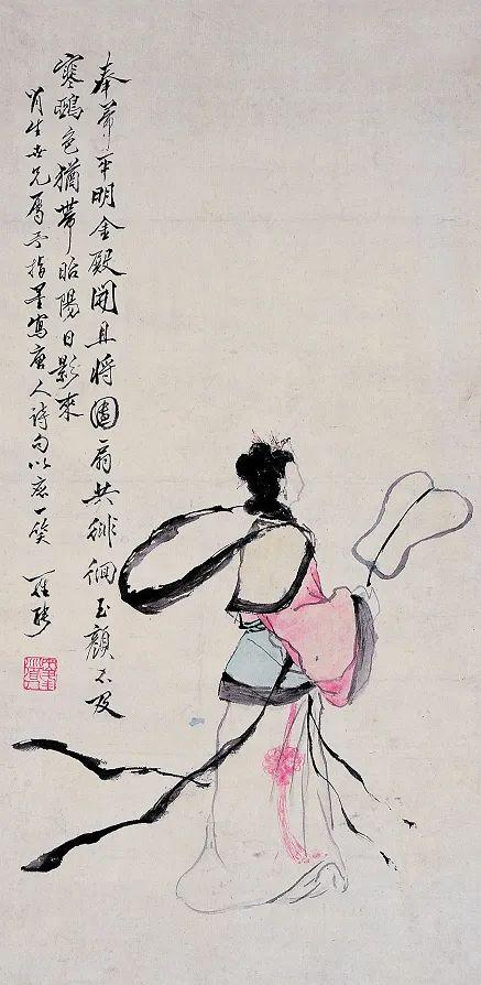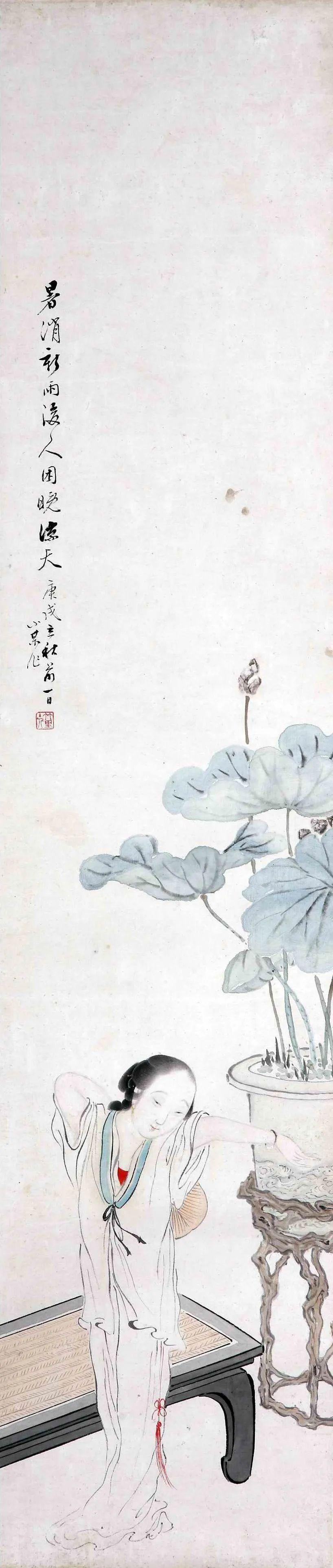 展出作品中,罗聘指画《唐人诗意图》较之一般的仕女画,构思较为独特。他以唐代宫女为题材,取王昌龄《长信秋词》意,以指代笔表现了一个失宠的宫女形象,画面中这个当年也许受过帝王青睐,现已玉颜不再的宫女手执团扇孤立画中,虽看不见她的容颜,但那满腹的哀愁却被罗聘表现得淋漓尽致。画家王素的《仕女消夏图轴》描绘了一位少女身着清凉且飘逸的小衫,手握一把蒲扇,似在伸懒腰,少女身后,一盆荷叶郁郁葱葱,一只荷花花苞向上伸展,画面十分生动,一旁还有题字“暑消新雨后,人困晚凉天”。