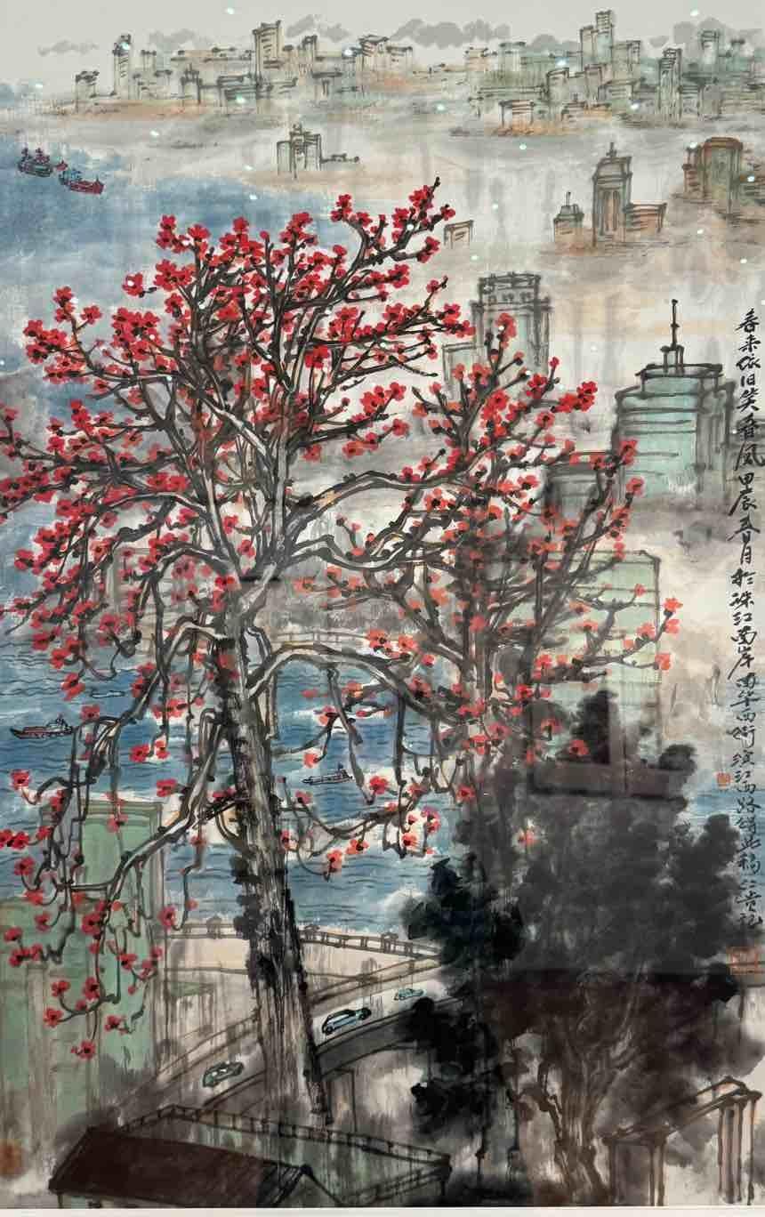 金仁贵则以水墨长卷演绎东方美学的山河礼赞。《岭南春晓图》中青绿泼彩点染木棉灼灼,《大江歌罢》里焦墨皴擦勾勒峡江奔涌。艺术家突破传统山水范式,在留白处题写原创诗词,使巍峨峰峦与苍劲书法共构诗意空间,既是对故土深情的当代诠释,亦为城市精神注入隽永的文化注脚。
