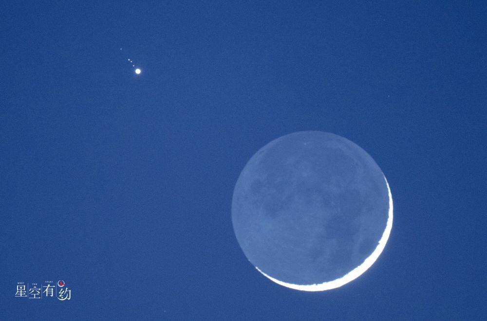 2019年11月28日在云南曲靖会泽县拍摄的木星与四颗卫星伴月。(周少华 摄)