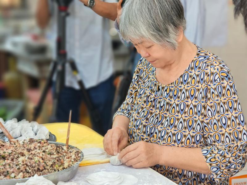 长桌边上有一个头发花白的老人,她就是陈玲开,当被问及水晶饺的制作技巧时,她的话匣子一下就打开了。陈玲开是大岭村本地人,年轻时,她曾外出打工制作糕点,但是由于孩子年幼、挣钱不多,她便回家以家庭手工作坊形式经营起一个小小的摊档,自己制作云吞、水晶饺、包子、肠粉、面条等早餐面点。