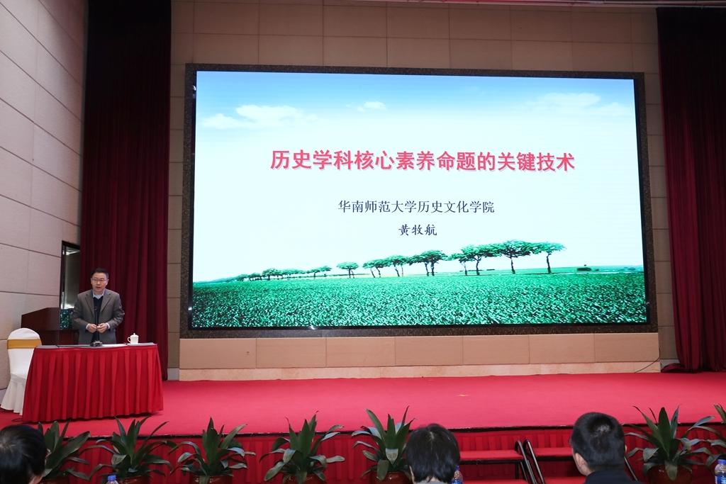 华南师范大学历史文化学院黄牧航教授作《历史学科核心素养命题的关键技术》主题报告,提出要重点研究“聚焦价值观念”“创设情境问题”“加强开放评价”“完善分层赋分”四大核心素养命题关键技术,通过命题技术传递核心素养,培养学生家国情怀。讲座结束后,嘉宾和与会老师进行了热列交流。