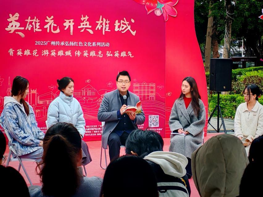 红棉似火映文脉,一场以红色诗词为开篇的阅读盛宴在英雄树下拉开帷幕,市民们或驻足聆听穿越时空的诗意朗诵,或沉浸于情景交融的深度阅读分享,在红棉文脉浸润中感受信仰的力量。“寻常巷陌,忆当年志士,往来行迹。一卷雄文光焰起,照破孤灯岑寂。”杨家祠曾是杨匏安工作的地方,在这里,他挥毫泼墨,那些铿锵有力的文字在人们心中播下信仰的种子。朗诵演员王婷、张子晗演绎了诗人高旭红的《念奴娇 广州杨家祠》,共同追忆了这段岭南红色历史。