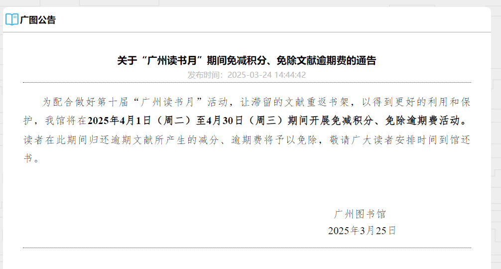 读书月期间,广州图书馆领衔全市公共图书馆推出“免减积分+免逾期费”惠民政策:4月1日至30日期间,读者归还逾期文献可免除逾期费、免减积分,助力市民“轻装”参与阅读活动;并在4月23日(周三)“世界读书日”安排照常开馆,以暖心服务扩大阅读覆盖面。