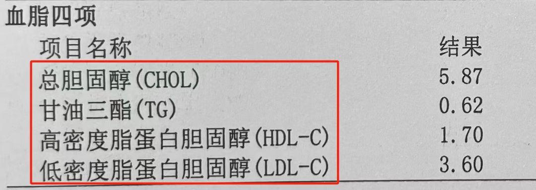 血脂不是单一指标,翻看体检报告中的血脂四项(如下图),除了高密度脂蛋白胆固醇是应该适度高一些的“好胆固醇”,其他三项都是需要降低的“坏胆固醇”。