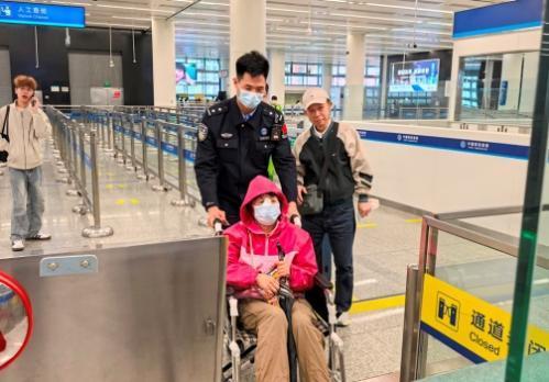 皇岗边检站民警用轮椅护送身体突发不适急需返港治疗的香港马女士安全顺畅返通关