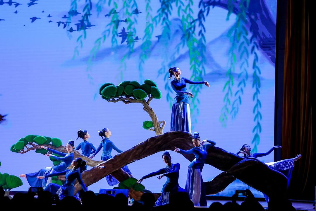 执信路校区舞蹈团的师生还将今年春晚中的舞蹈节目《喜上枝头》搬上了艺术节的舞台。参与该节目的易安妮同学分享道,对她来说这是一次非同寻常的表演。“虽然之前也参加过许多舞蹈排练,但这次用到了大型道具,我们通过滑下滑梯去模仿喜鹊飞翔的姿态,要将喜鹊灵动俏皮的形象展现出来,非常考验身体的控制力,以及我们对喜鹊形象的解读和演绎。”