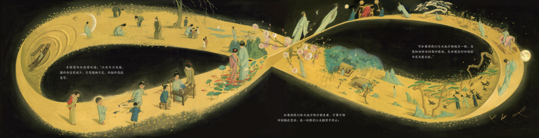 中国传统色里的翠微、雪青、苍葭、青黛、秋香……于纸页间流动,更奇妙的是,作者还运用了19世纪德国数学家提出的结构模型——莫比乌斯环,将艺术和科学巧妙融合地去呈现这样一个永恒与瞬间、变与不变、存在与意义的千古话题,令人惊叹。