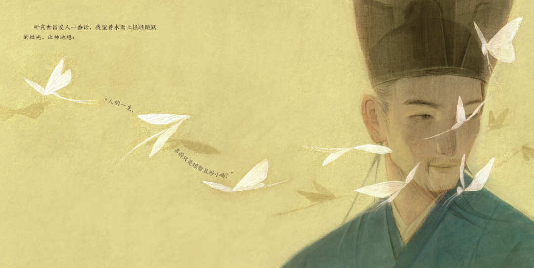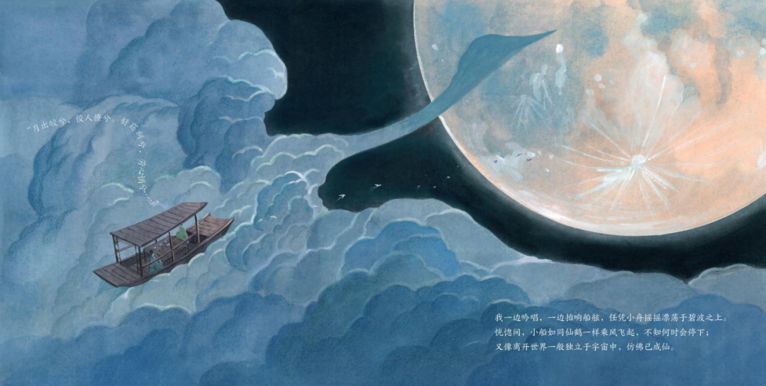 绘本开篇是宁静柔和的画面,把江天分为两部分,一下子就把孩子带入九百多年前的那个月夜。让孩子跟随苏东坡的自述,一起江上泛舟,赏月、吟诗、饮酒,“飘飘乎如遗世独立,羽化而登仙”。层云如同仙鹤的羽毛,飞向新时代的月亮,让人不禁想象那月亮上是今人还是古人?就这样乘着仙鹤,展翅而飞,来一场穿越古今的艺术想象!