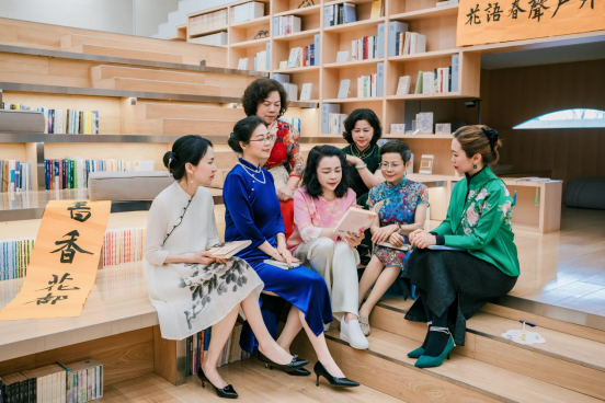 在图书馆内,巾帼志愿者们围坐在一起,她们用粤语、英语、普通话三种语言,时而韵味悠长地吟诵,时而深情款款诵读,时而用流利的英语娓娓道来。