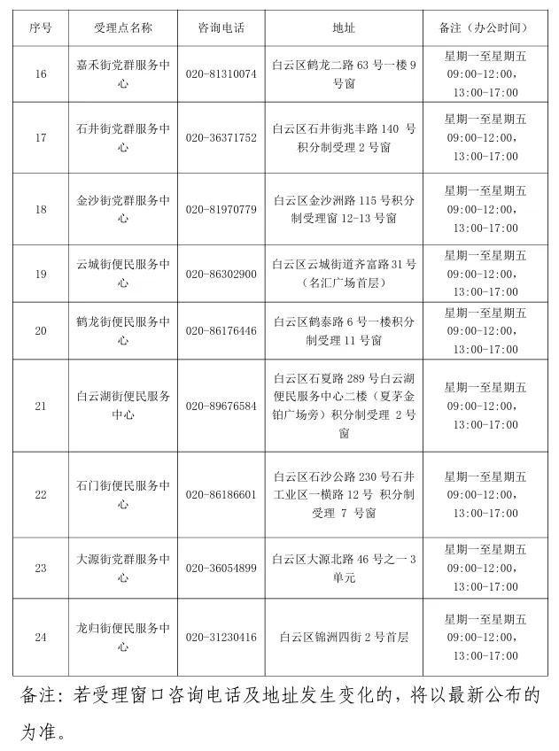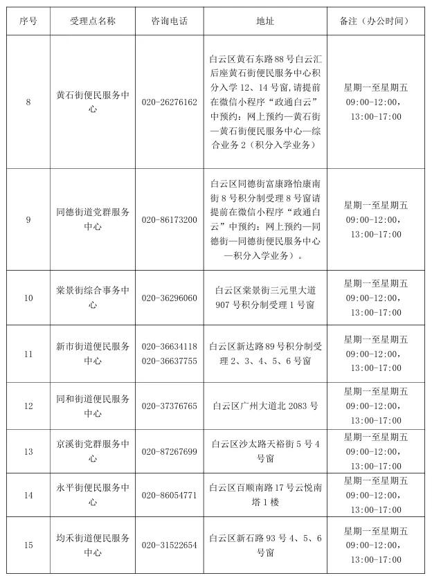 广州市白云区来穗人员随迁子女积分制入学受理窗口咨询电话及地址: