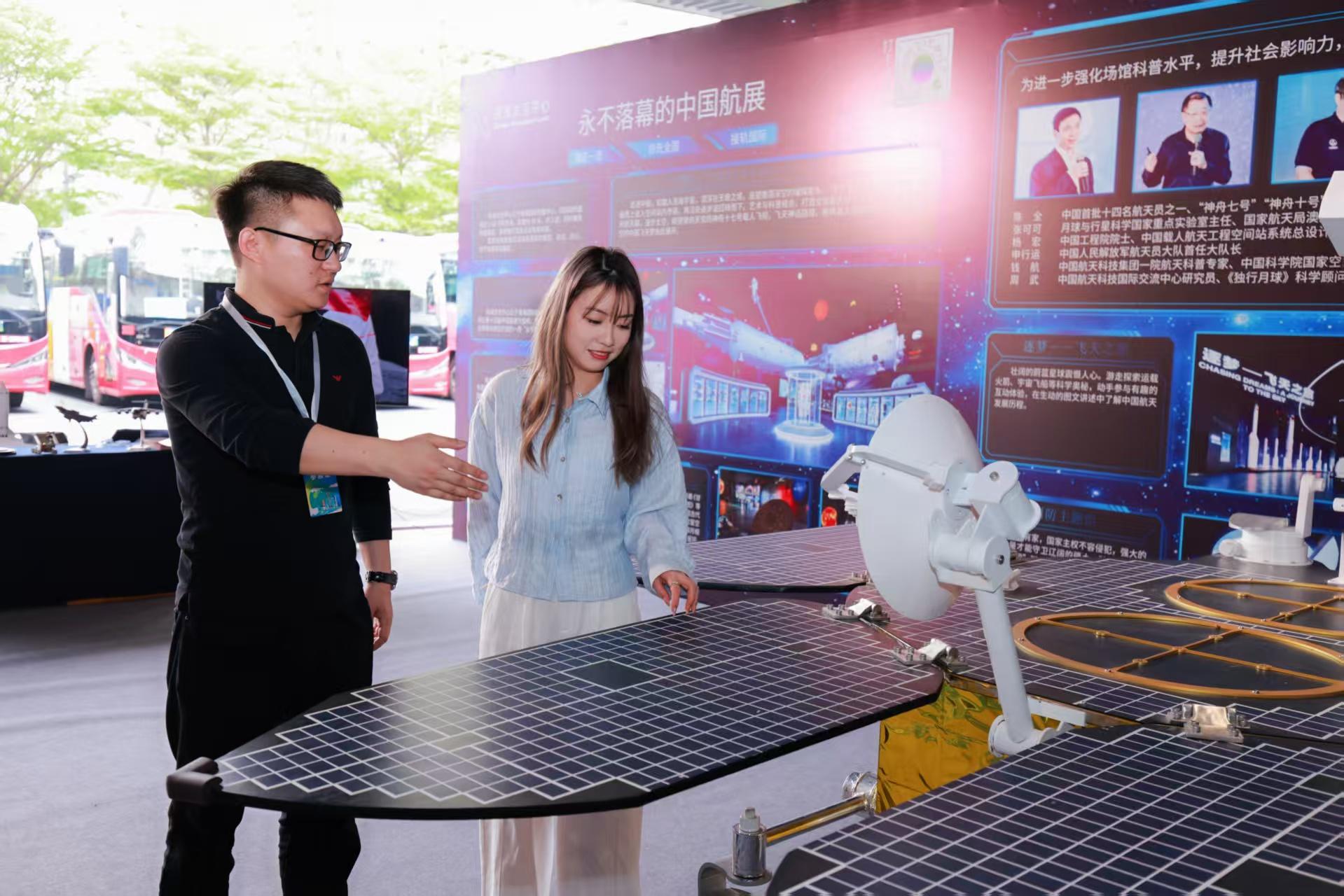 活动期间,与会嘉宾登上“旅游新供给号时光列车”,沉浸式体验智慧景区、科技演艺等五大主题展区,26家企业通过互动装置、实景演示展现创新成果。在“非遗梦站”,活字印刷与甲骨文解码让千年文化触手可及,肇庆四会古法造纸技艺升级为“粤路纸”文创品牌。“智在云天站”依托VR技术,带领观众穿越《山海经》神话世界。“太空中心站”以1:1天宫空间站模型和AR技术,构建未来科技与传统文化交融的沉浸空间。科技秀场更是亮点纷呈:深圳大漠大智控的500架无人机编队以“文旅”二字点缀广州塔上空;亿航智能载人飞行器完成低空观光飞行演示;优链时代3D数字人技术实现“5分钟生成元宇宙分身”,为景区虚拟代言人提供技术支撑。