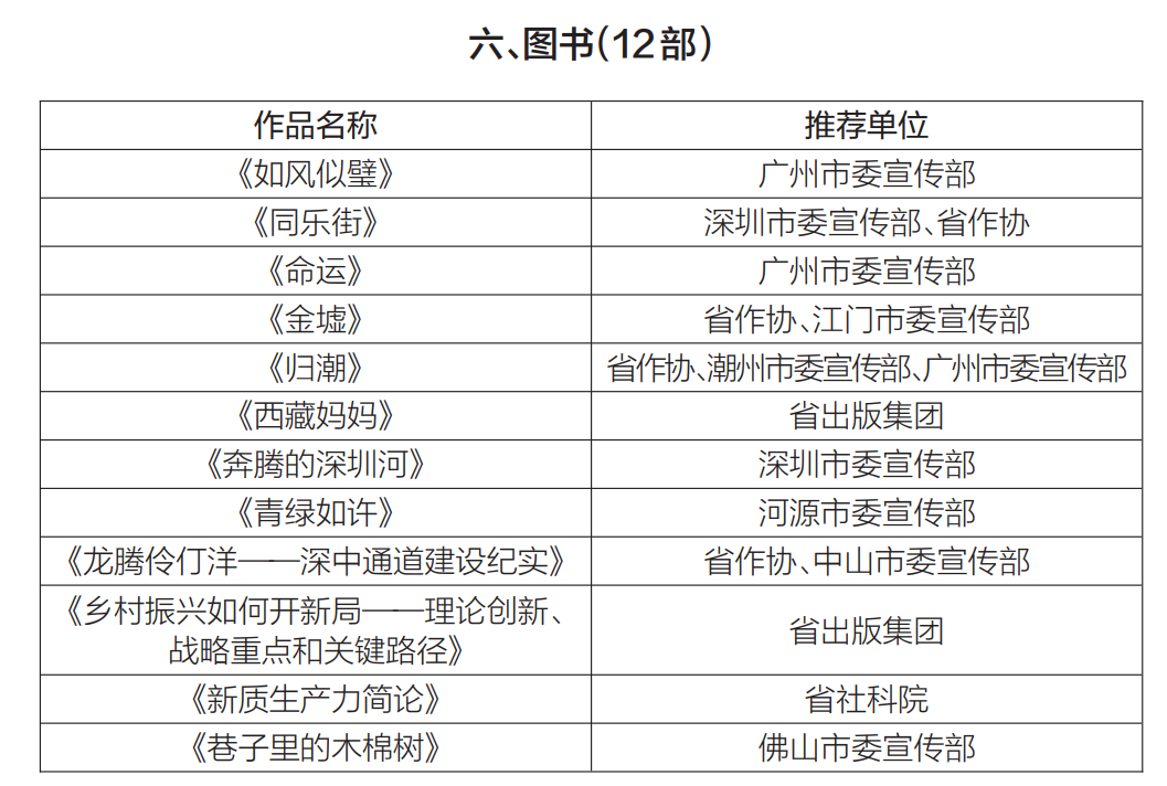 全省共60部作品入选,涵盖图书、戏剧、电视剧、广播剧、歌曲、电影六大门类。在12部图书类获奖作品中,广州作家张欣所著《如风似璧》与陈崇正新作《归潮》获奖。