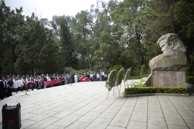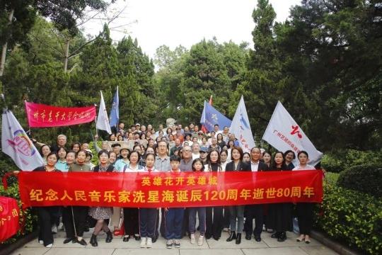 4月10日,由湾区合唱联盟发起的“英雄花开英雄城——冼星海诞辰120周年逝世80周年祭奠活动”在广州麓湖公园星海园举行。
