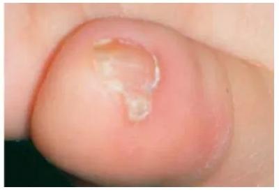嵌甲,即指甲往肉里长,多因指甲剪太短;