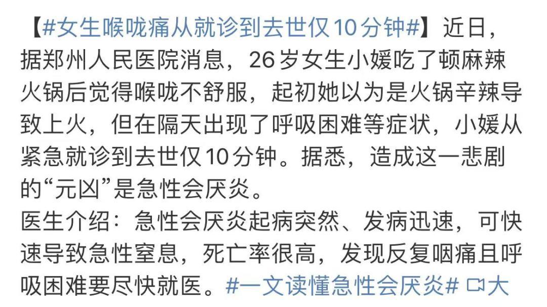 热搜里26岁女生小媛(化名)的情况并非个例,有约君搜索发现,近年时有关于急性会厌炎的案例报道——