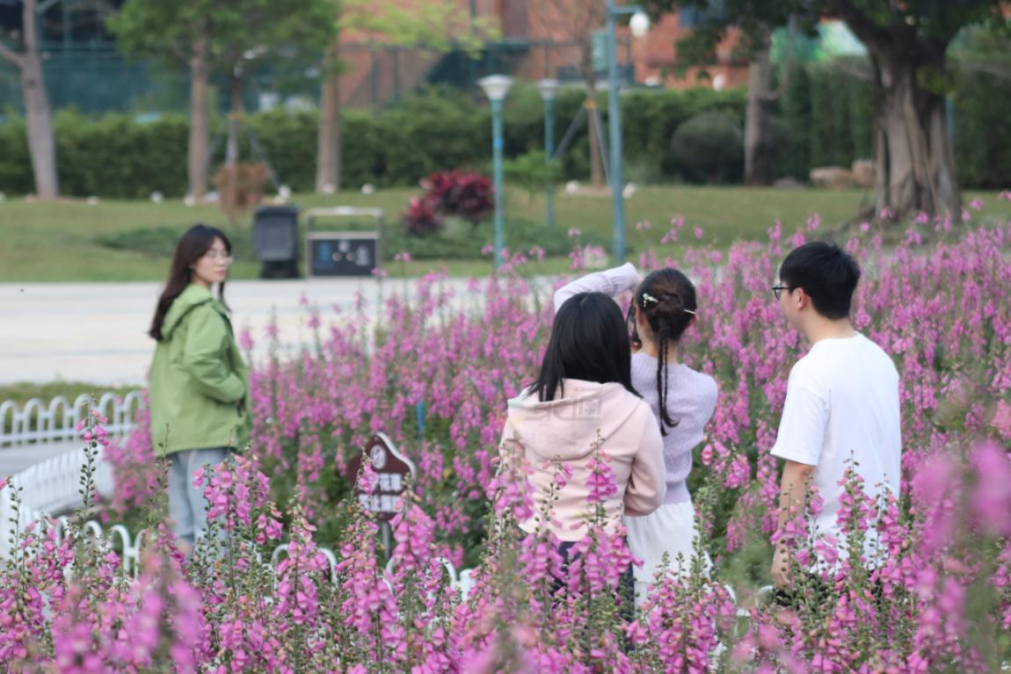暖春时节,二沙岛宏城公园新栽种的毛地黄花盛放,汇聚成一片紫红色花海,璀璨夺目的鲜花吊挂成串,一片无际,风景美不胜收。