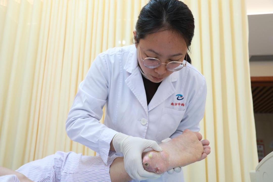 风湿病科毕亚男医生为患者检查足底痛风石。
