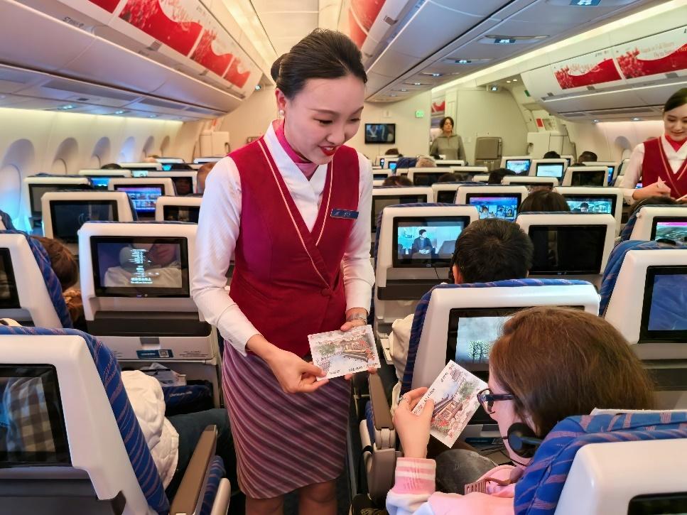 航班进入平飞阶段后,客舱内悄然换上了“木棉主题装束”——行李架上悬挂着红艳似火的木棉花装饰,乘务员手持印有粤剧与木棉元素的“潮墟·花城课堂”明信片,带着文化传承跨界的新载体,同旅客们展开了一场别开生面的文化对话。明信片是以“英雄花开英雄城”主题活动的20个红色重点场馆为背景,向乘客们介绍广州的红色文旅景点,乘客还可以通过扫描明信片上的二维码,收听英雄主题故事。“木棉是广州的市花,它又称‘英雄花’,承载着这座城市的红色历史与奋进精神。”乘务长用中英文向旅客娓娓道来。荷兰旅客扬·德弗里斯接过憨态可掬的木棉公仔,惊喜道:“这抹红色让我想起广州的活力,期待亲眼看看英雄树!”