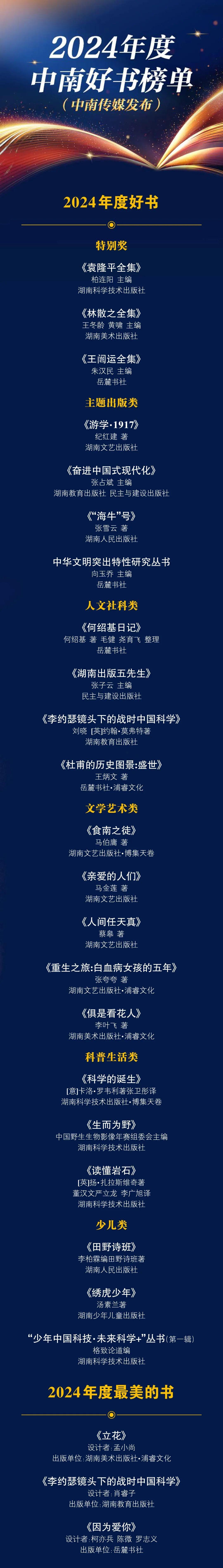 中国出版协会、中国图书评论学会、中国编辑学会、韬奋基金会和中国国家版本馆等相关负责同志及出版界专家、作家代表出席,为2024年度中南好书上榜的22种年度好书、3种年度最美的书颁奖。