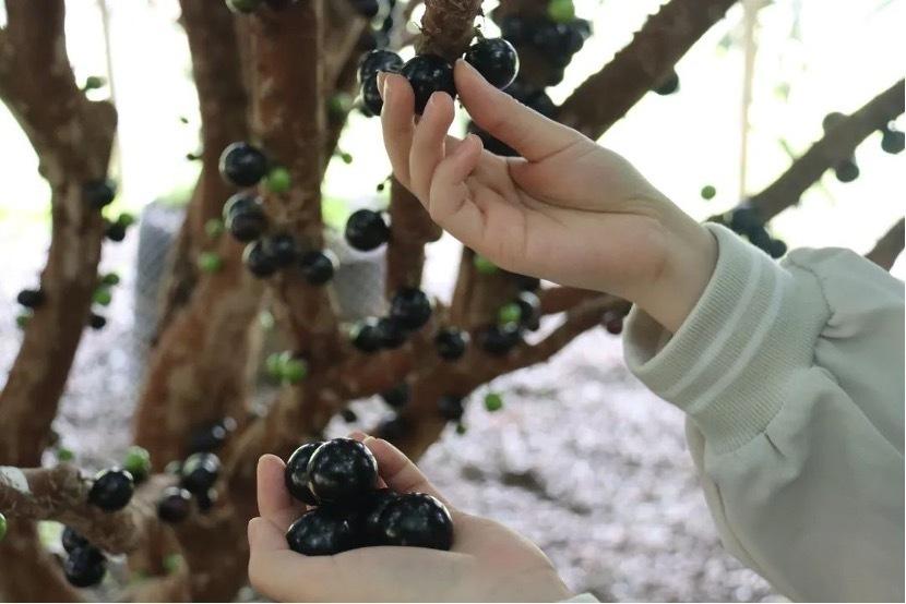 走进山美村嘉宝果采摘园,一排排嘉宝果树的树干上长满了圆滚滚的果实,游客穿行树下尽情享受采摘乐趣。