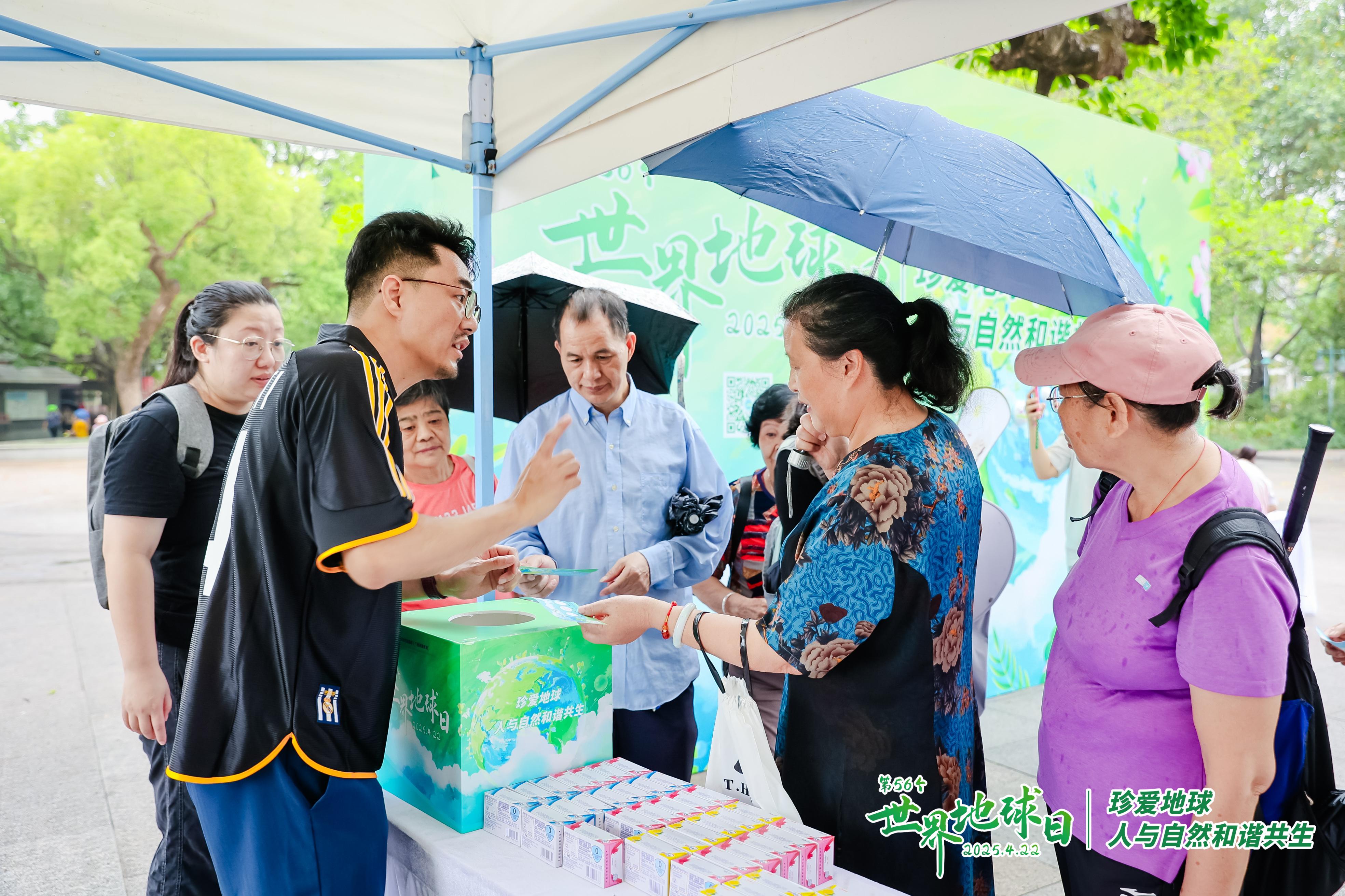 清晨,流花湖公园绿意盎然,葱郁草木蒙上了一层阴天朦胧滤镜。虽然不时下着小雨,却丝毫没有冲淡活动的氛围。世界地球日的宣传展板、展品点缀其间,与自然景色相映成趣。市民们被吸引而来,纷纷驻足观看展板,了解环保知识,积极参与互动。