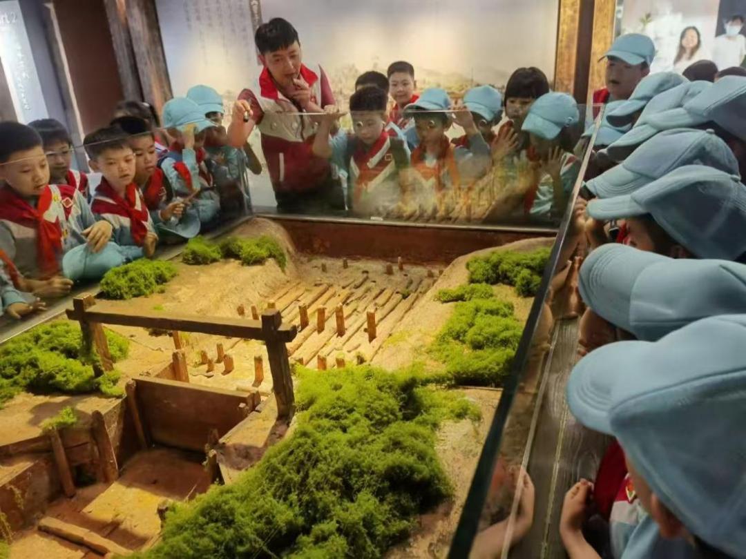 活动中,师生队伍沿着北京路核心轴线,探访千年水闸遗址、古道遗迹、金融博物馆等文化地标。在北宋水闸遗址前,学生们通过讲解员的生动讲述,惊叹于古人治水智慧;俯身观察古道青砖上的车辙印记,仿佛穿越回千年商都的繁华盛景;金融博物馆内岭南钱庄的场景复原,则让“千年商都”的传承与创新可触可感。