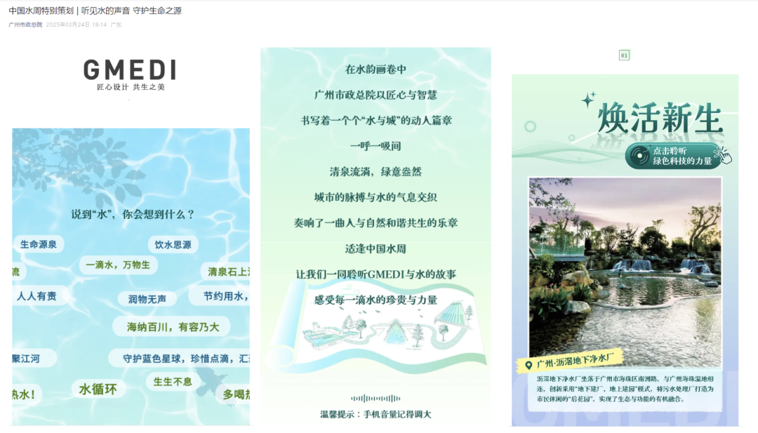 为进一步宣传节水爱水理念,展示水生态建设的成果,广州市政总院特别策划“中国水周有声系列海报”宣传活动。通过这一创新形式,选取具有5个关于水的项目,以画面+人声+背景音的结合,展现总院在供水保障、污水处理、净水厂建设、智慧水务等方面的贡献,共同守护生命之源。
