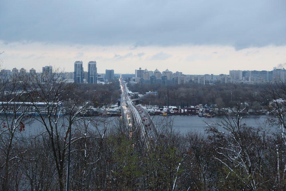 这是2024年11月21日在乌克兰首都基辅拍摄的白雪映衬下的地铁桥和第聂伯河。新华社记者李东旭摄