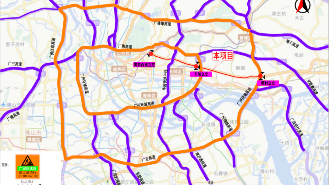 【广园快速路禺东西路至笔村立交路段将于4月28日起凌晨占道施工】自4月28日起,广园快速路(禺东西路至笔村立交路段)实施品质化提升工程,预计工期为3个月。请过往车辆在施工期间,根据交通管制措施和现场交通指示标志,合理规划出行路线,建议依托南北两侧高速公路、周边主要平行城市道路进行绕行。查看详情>>