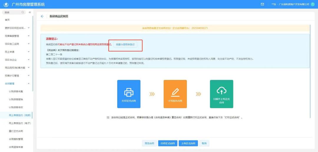 现在,通过两局系统无缝对接,购房者在售楼部完成网签后,一键跳转至广州市不动产登记网办系统直接办理预告登记,实现“一件事一次办”,流程效率双提升。