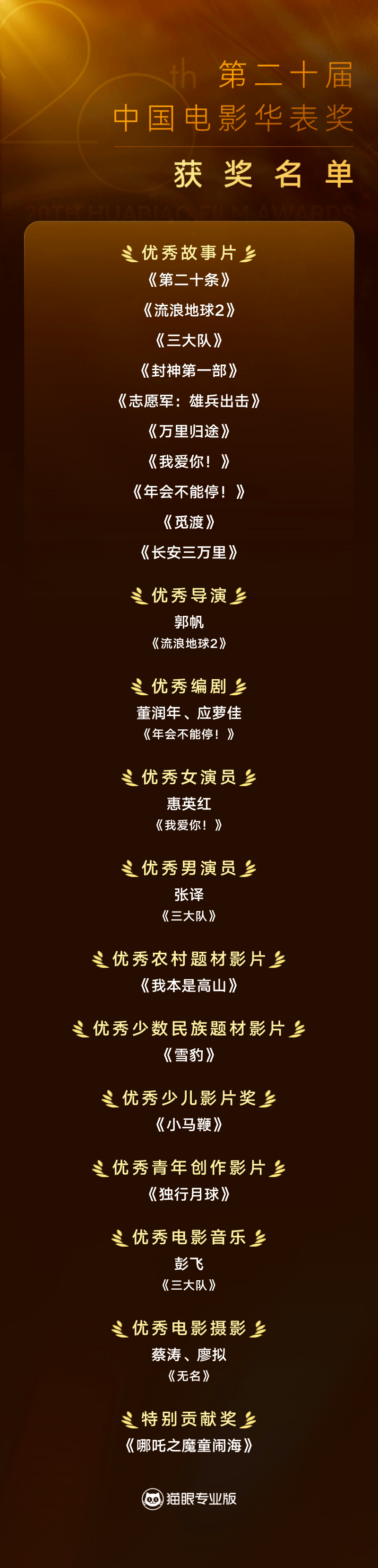 最终,10部影片获得第二十届中国电影华表奖“优秀故事片”,分别是《第二十条》《流浪地球2》《三大队》《封神第一部:朝歌风云》《志愿军:雄兵出击》《万里归途》《我爱你!》《年会不能停!》《觅渡》和《长安三万里》;郭帆凭借《流浪地球2》获得“优秀导演”;张译、惠英红分获“优秀男演员”和“优秀女演员”荣誉;董润年、应萝佳凭借《年会不能停!》获得“优秀编剧”;蔡涛、廖拟凭借《无名》获得“优秀电影摄影”;彭飞凭借《三大队》获得“优秀电影音乐”;《独行月球》获得“优秀青年创作影片”;《我本是高山》获得“优秀农村题材影片”;《小马鞭》获得“优秀少儿影片”;《雪豹》获得“优秀少数民族题材影片”;《哪吒之魔童闹海》获得特别贡献影片荣誉。