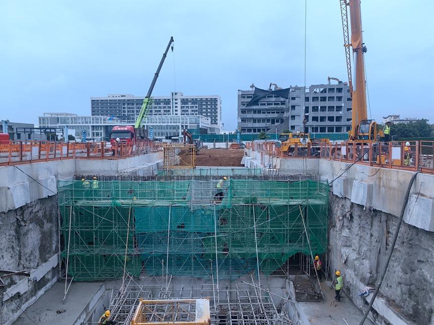 深莞隧道东段3#盾构始发井位于城市密集区,施工面临多重挑战。基坑深度最深达32.4米,围护结构采用1米、1.2米厚地下连续墙,主体为双层框架结构;场地狭小,土石方量超10万立方米,且需穿越复杂地质层,邻近既有建筑物及密集地下管线,安全风险极高。“自2023年进场以来,项目部以‘毫米级精度’推进施工。”项目总工程师介绍,项目部通过BIM技术模拟基坑开挖、优化地连墙施工工艺,并联合专家团队对深基坑支护方案进行10余次论证,最终实现基坑变形量控制在3毫米以内,创下同类工程安全管控标杆。项目经理表示,下一步将投入一台直径8.8米盾构机,以“零沉降”标准穿越珠江口复杂地层,全力冲刺全线通车目标。