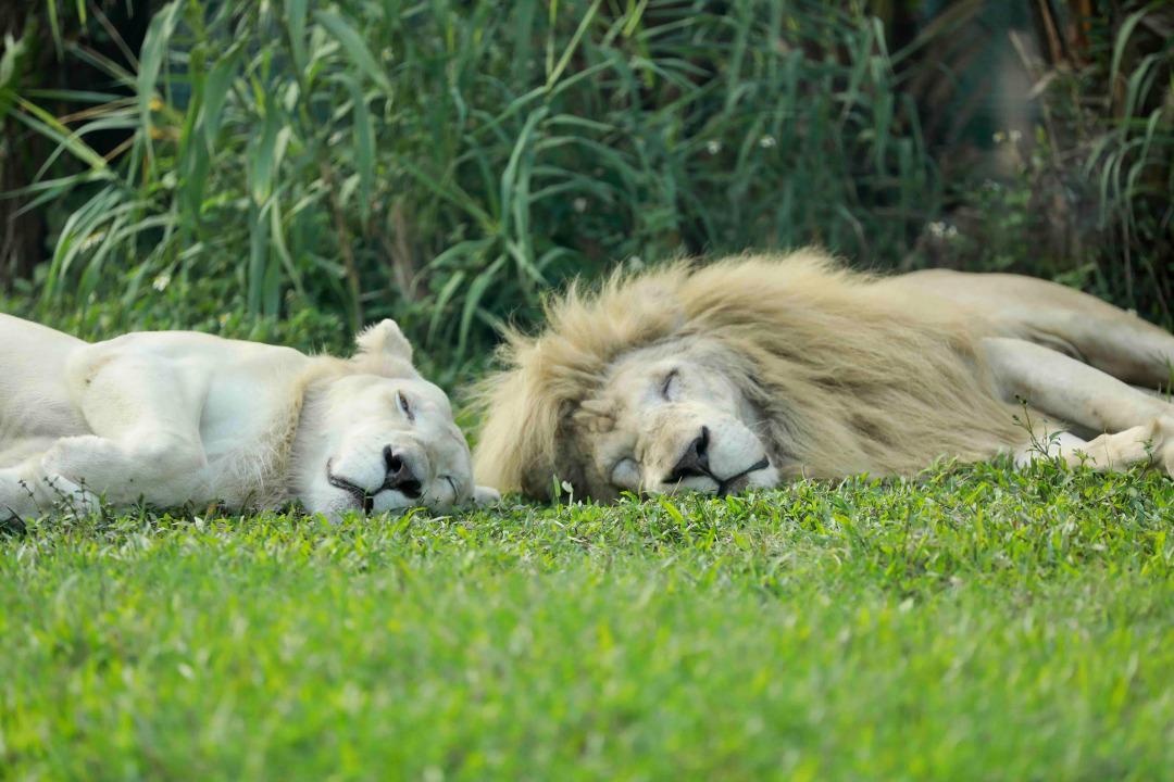 非洲狮“阿杭”“贝贝”一天也会睡上十几个小时,感情甜蜜的夫妇俩常常相伴入眠,喜欢四肢伸展,让身体放松,仰卧或者侧卧睡觉。