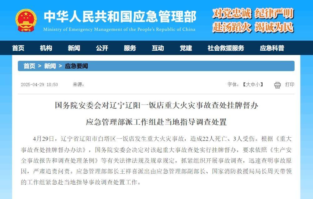 4月29日,辽宁省辽阳市白塔区一饭店发生重大火灾事故,造成22人死亡、3人受伤。根据《重大事故查处挂牌督办办法》,国务院安委会决定对该起重大事故查处实行挂牌督办,要求依照《生产安全事故报告和调查处理条例》等有关法律法规及规章规定,抓紧组织开展事故调查,迅速查明事故原因,严肃追责问责。应急管理部部长王祥喜派出由应急管理部副部长、国家消防救援局局长周天带领的工作组紧急赴当地指导事故调查处置工作。