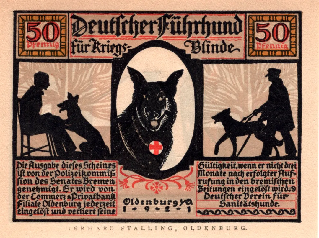 1921年发行的一张德国邮票上印着导盲犬的图案。1916年,第一家导盲犬训练中心在德国奥尔登堡成立,旨在帮助第一次世界大战期间失明的士兵。