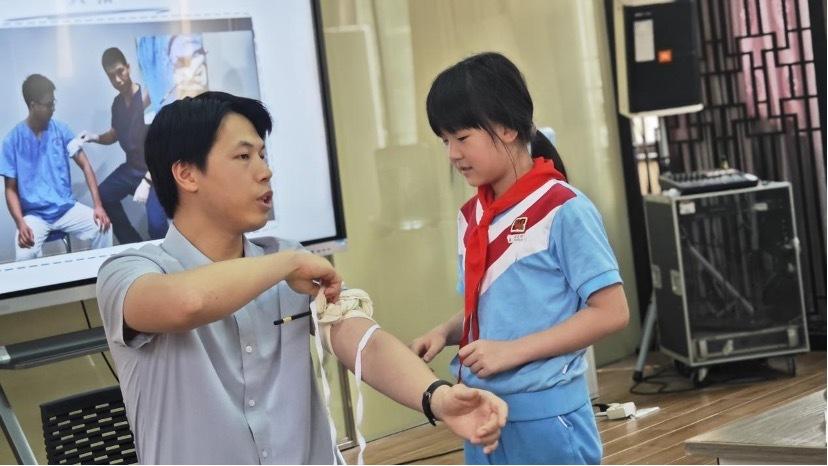 4月29日,文德路小学“厚德学堂”迎来新一期健康主题课程。广东省中医院大德路总院急诊科副主任曾瑞峰以“损伤出血的中医妙招”为主题,为学生们带来一堂生动实用的急救知识课。