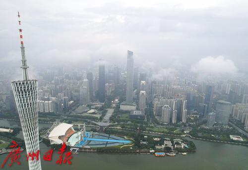 5月7日,广州城区有小雨。傍晚,珠江新城CBD上空雨雾环绕。