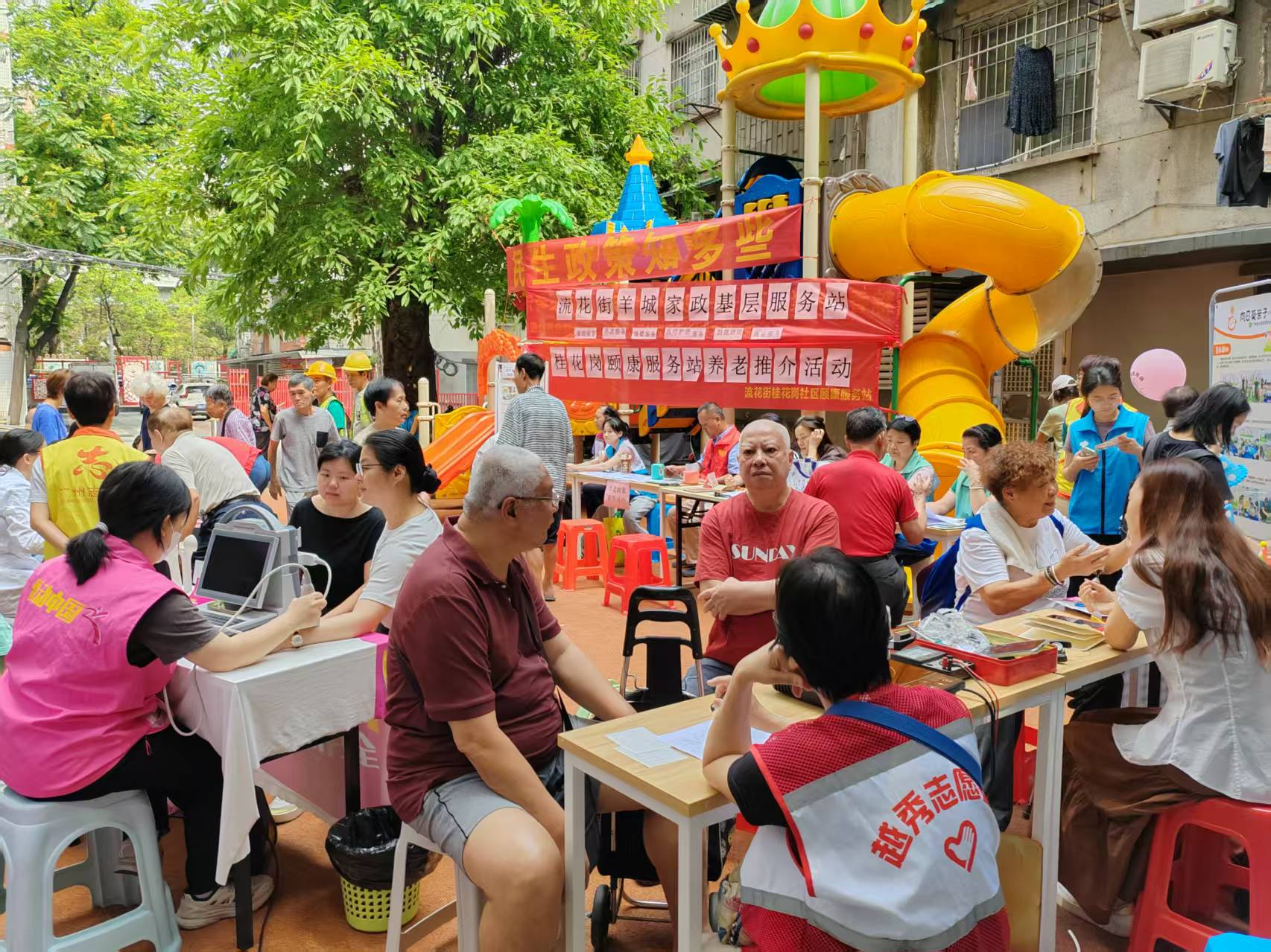 活动现场设置多元主题养老服务功能区。在健康义诊区,来自流花街社区卫生服务中心和中山大学孙逸仙纪念医院的专业医护人员,为长者们提供免费的骨密度测试、中耳检查、认知能力检测、听力测试、预防登革热健康咨询等多项服务。