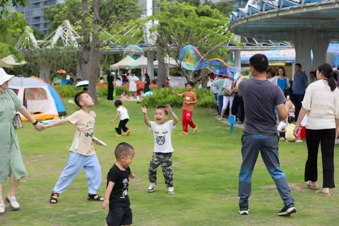 草坪上帐篷林立,或家庭出游,或好友成行,伴着乐队演唱的惬意,孩子们追逐多彩泡泡,遛狗、捞鱼、踢球……岸边潮声应和这一片欢声笑语,构成一幅生动的假期图景。