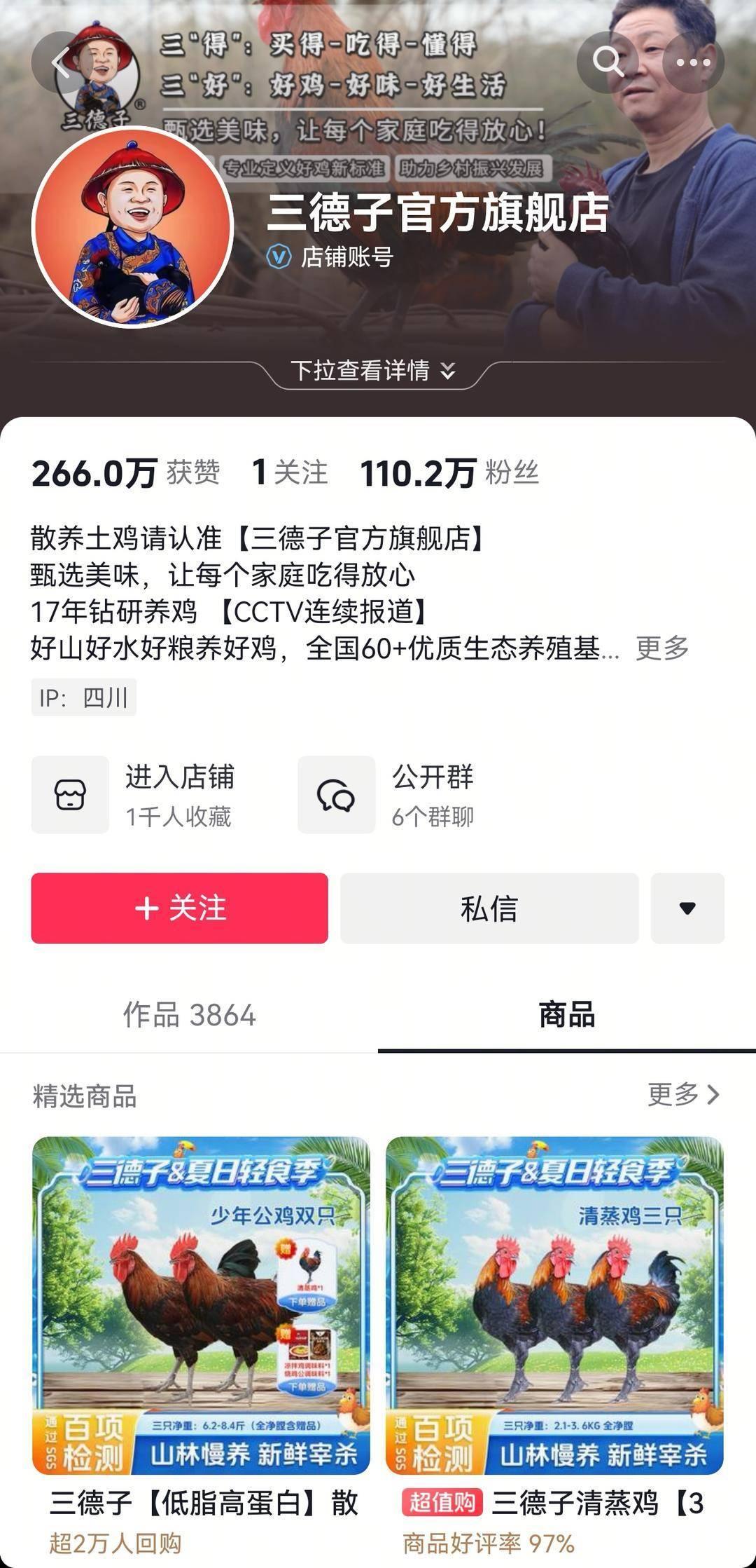 赵亮在某电商平台的店铺“三德子官方旗舰店”,粉丝数已超过110万。店铺认证企业为成都三德子好甄选农业科技有限公司,售卖的商品以不同种类鸡肉为主。