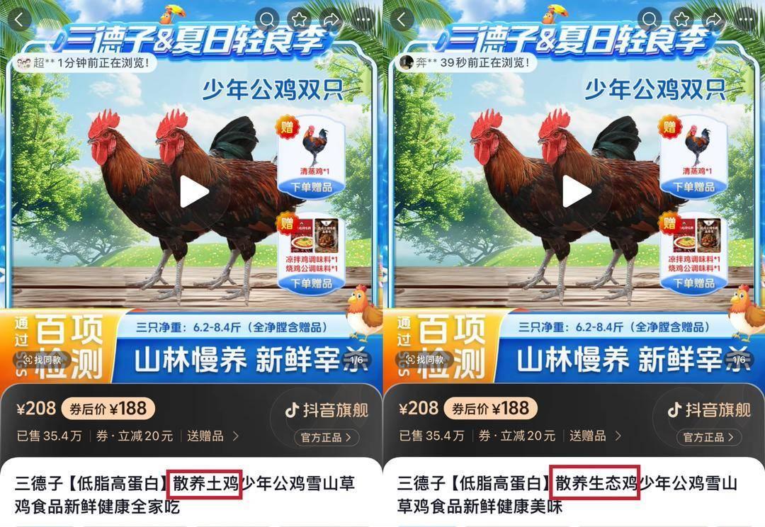 以其中的一种“少年公鸡”为例,8日13时38分,记者查看时,该商品名称中还包括“散养土鸡”,而在当天14时55分,该商品名称中的“散养土鸡”,已变为“散养生态鸡”。截至5月8日14时55分,该款商品销量超35万,位居该电商平台土鸡爆款榜第5名。而当记者向客服询问时,对方坚称所售卖商品“当然是土鸡”。