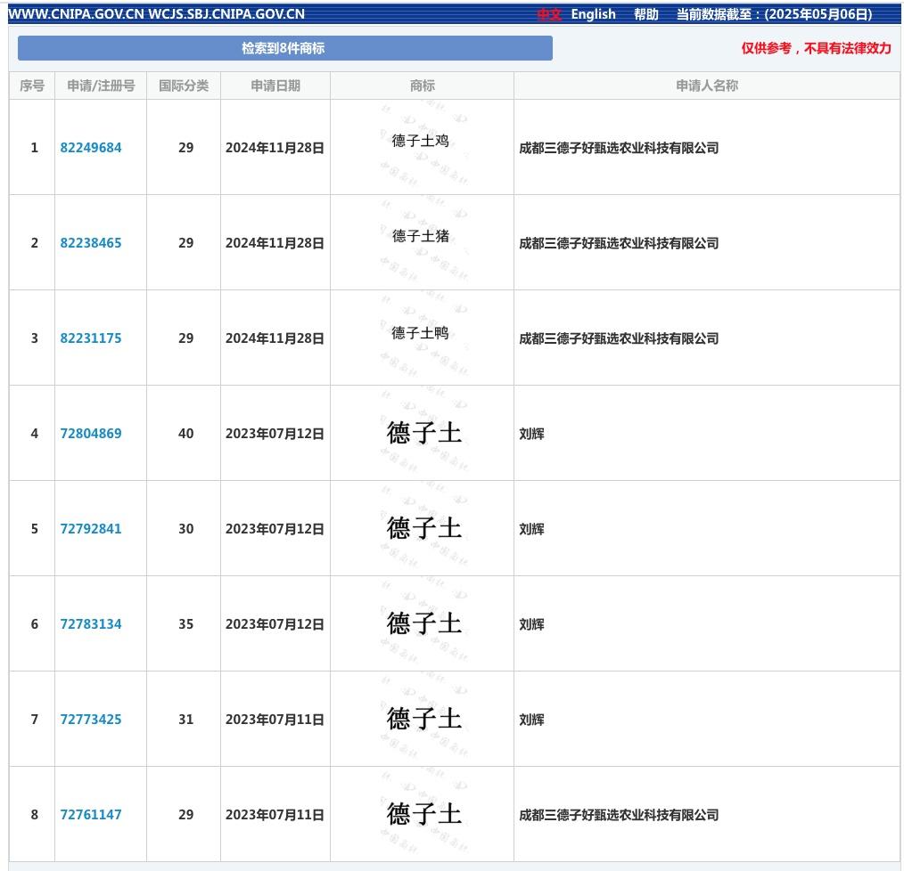 除“德子土”商标之外,中国商标网显示,成都三德子好甄选农业科技有限公司还曾于2024年11月,申请注册“德子土鸡”“德子土猪”“德子土鸭”等商标,国际分类均为29,目前这三枚商标的状态均为“等待实质审查”。