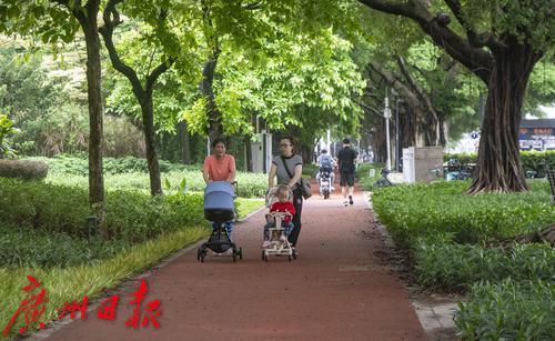 沿江东路绿树成荫的珠江碧道上,市民在散步。
