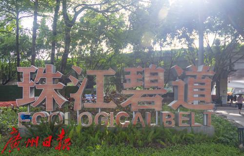 沿江东路绿树成荫的珠江碧道上,市民在散步和运动。