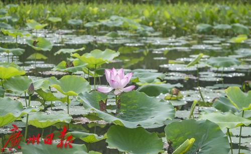 5月9日,东山湖公园,数株早开的荷花点缀在一片碧绿的荷塘之中分外醒目。据了解,广州的荷花一般在5月底至9月开放,其中6月中旬至8月是盛花期,要看到满目荷花的场景还需要等待一段时间。