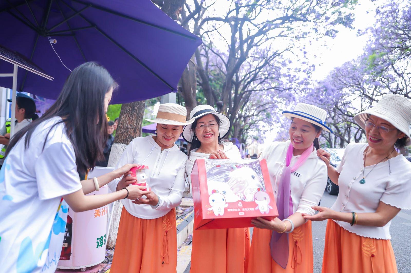 上午十点,昆明教场中路上蓝花楹肆意绽放,市民游客在花下驻足拍照。十五运会和残特奥会吉祥物“喜洋洋”“乐融融”“空降”街区,瞬间成为市民游客围观拍照的焦点。