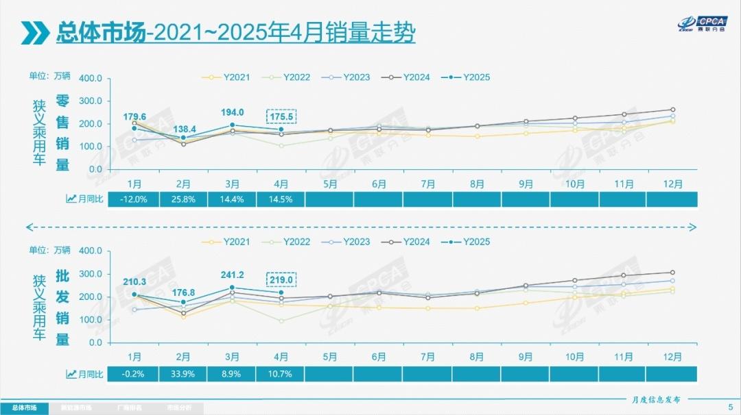 5月11日,全国乘联分会发布2025年4月份全国乘用车市场分析。数据显示,4月全国乘用车市场零售175.5万辆,同比增长14.5%,环比下降9.4%。今年以来累计零售687.2万辆,同比增长7.9%。
