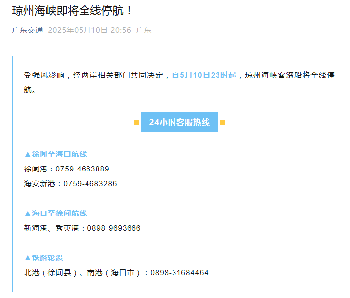 广东交通微信公众号消息,受强风影响,经琼州海峡南北两岸相关部门共同决定,自5月10日23时起,琼州海峡客滚船将全线停航。