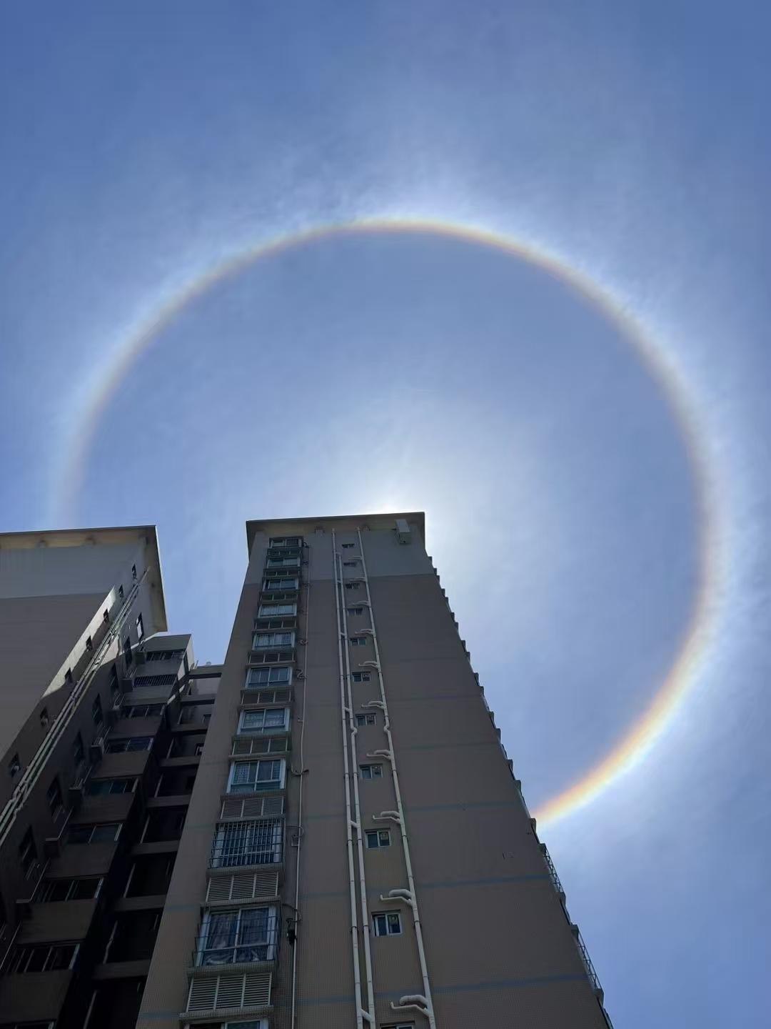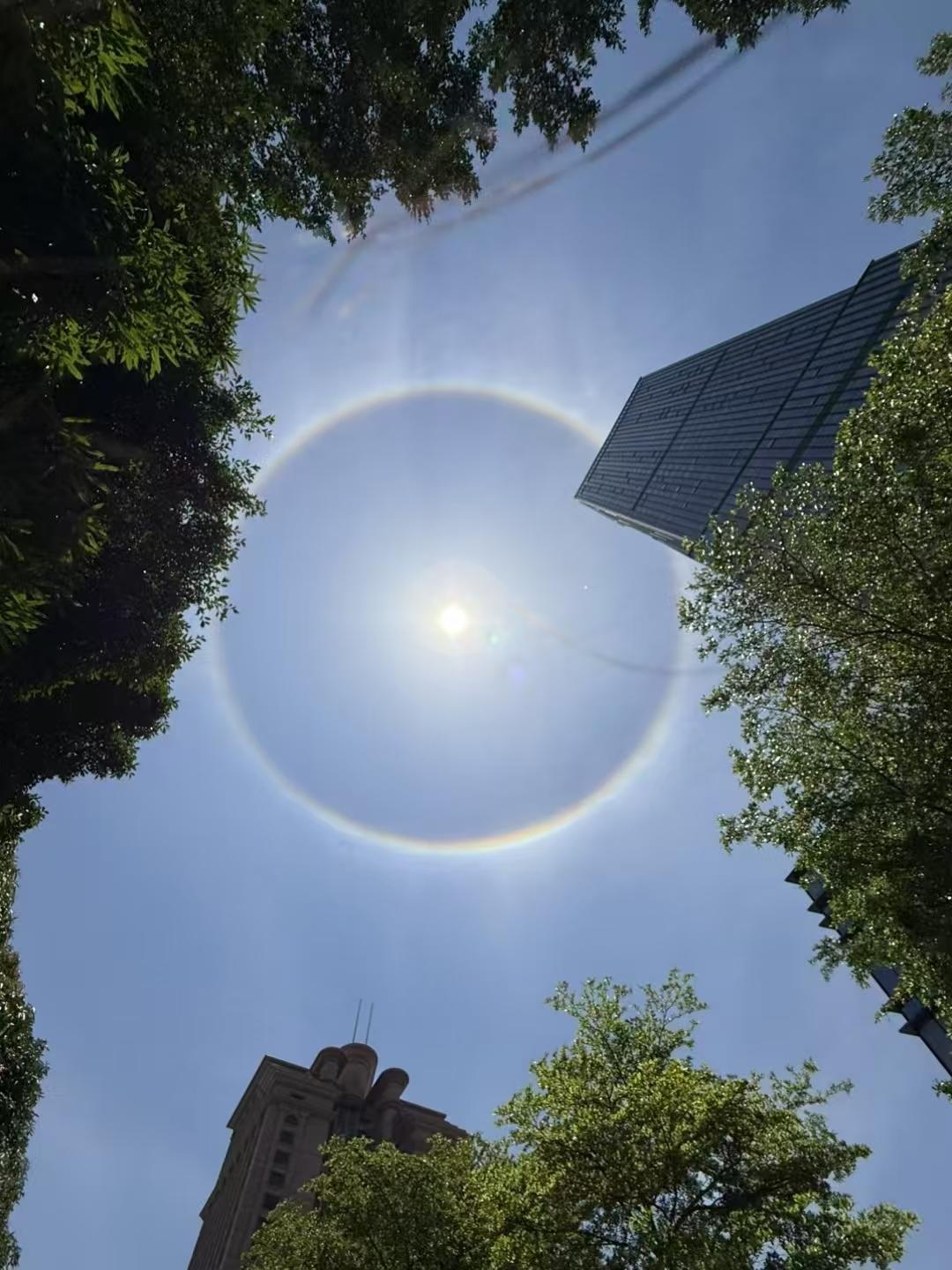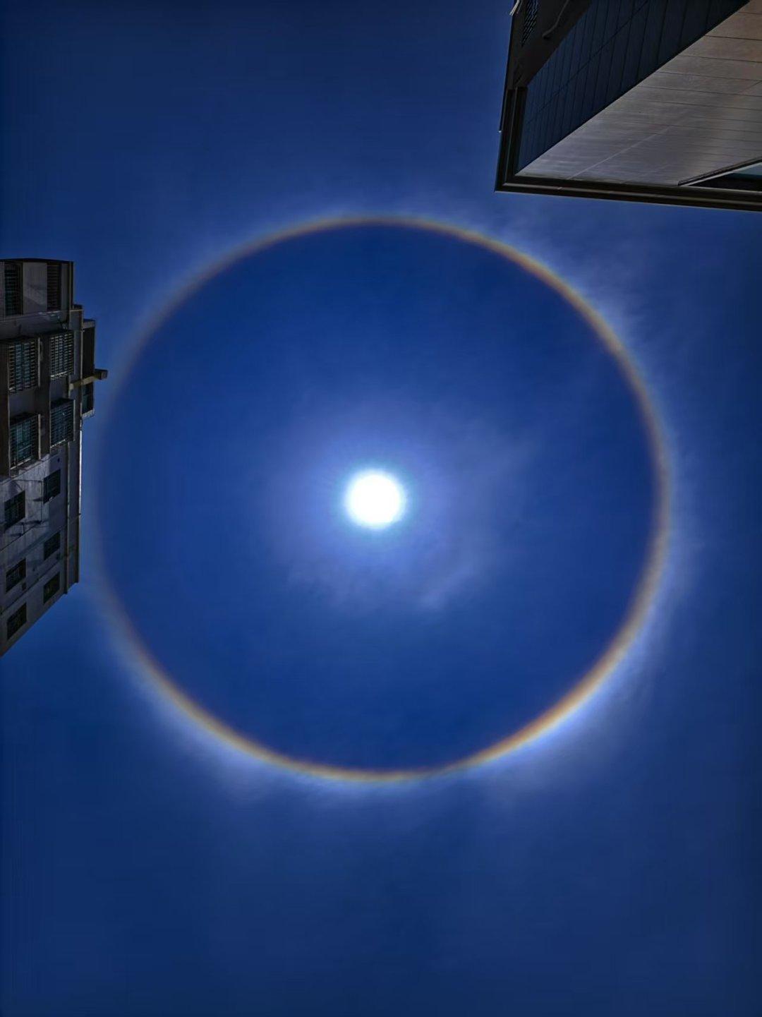 2025年5月13日中午1时许,广东湛江市区的上空惊现“天空之眼”的奇观~太阳被一圈七彩光环环绕,宛如巨型瞳孔悬挂天际。这一奇观持续至下午2:20左右才“云散烟消”,吸引了众多市民驻足拍摄。气象部门解读,此现象为日晕,是高空冰晶与阳光共同演绎的大气光学奇观。